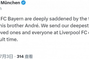 拜仁官方社媒在若塔讣告动态下面留言:“拜仁全体成员都对若塔及其兄弟安德烈的不幸离世深感悲痛。在这极其艰难的时刻,我们向他们的家人、亲友以及利物浦俱乐部全体同仁致以最深切的慰问。”